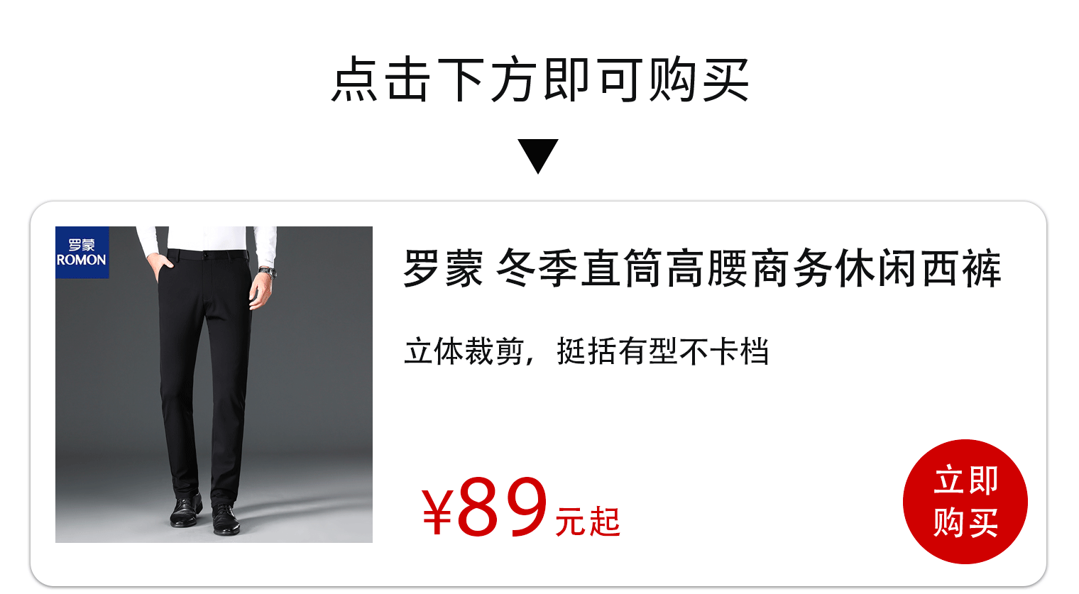 这款西裤是罗蒙根据男性身材特点3D立体剪裁而成,上身利落干练、垂顺舒适,无论谁穿,就是一个“帅”字。